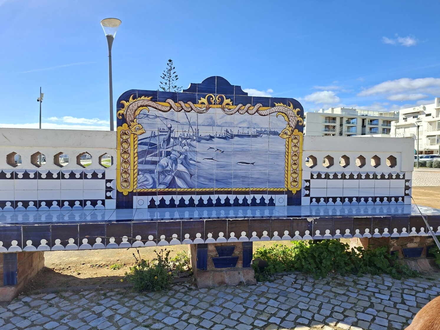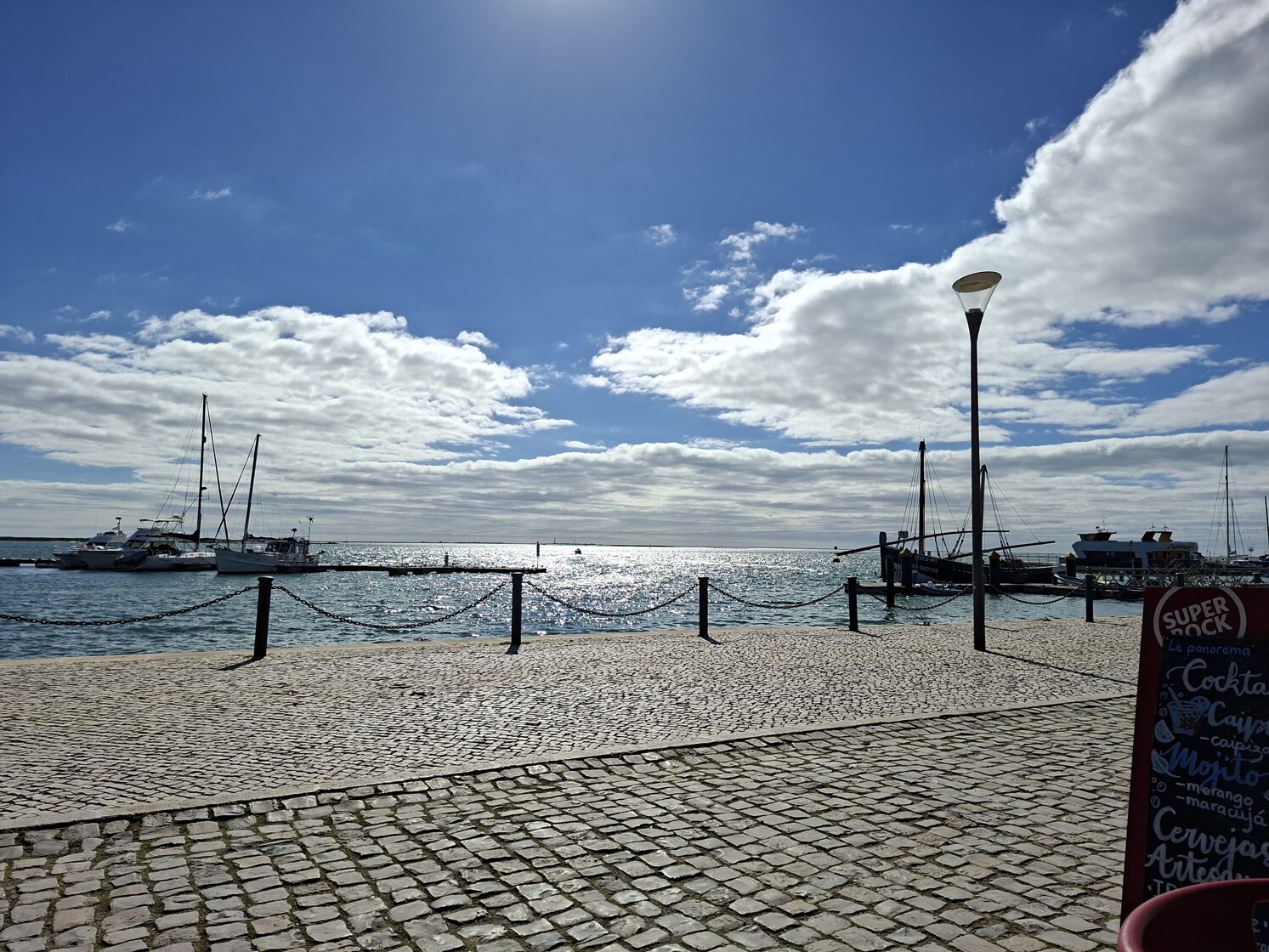 Olhaoban nagyon kellemesen sütött a Nap. Leparkoltam a part mellett és sétáltunk egy nagyot. Balra tőlünk motorcsónakok, vitorlások, alattuk és mögöttük az óceán, jobbra a piac épülete, melyet 1912-ben kezdtek építeni. Bemenni nem tudtam a kutyák miatt, így nem vagyok benne biztos, hogy még működik-e mint piac, azt viszont tudom, hogy az óceánparti oldalán éttermek vannak. Séta után le is ültem az egyik napsütötte asztalhoz és kalamárit rendeltem salátával és egy pohár száraz, hideg fehérborral. Szívtuk magunkba a napsütést, a gyerekek is nyugodtan heverésztek, néha ittak a nekik hozott nagy tál vízből. Körülöttünk sokan élvezték a szikrázó napfényt, a felettünk köröző, rikoltozó sirályokat, a hatalmas víztömeg látványát és morajlásának hangját.