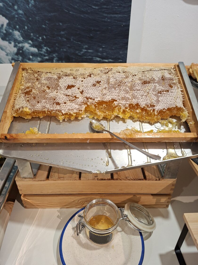 Reggel a kutyák olyan kis cukik voltak, amíg pakoltam - mindegyik az ágyában feküdt szép csendben, de azért fél szemmel figyeltek. A reggelinél volt egy érdekesség, amit muszáj volt lefényképeznem, annyira tetszett: egy igazi lépesméz volt a tálalóasztalon. Elragadó volt. A finom reggeli után a kutyákkal elsétáltam a parkolóhoz minimális adag poggyásszal, majd megálltunk a szálloda előtt a buszmegállóban és én felrohantam a cuccokért. Minden flottul ment, még a buszsofőr is intett, hogy látja és átérzi a helyzetemet.