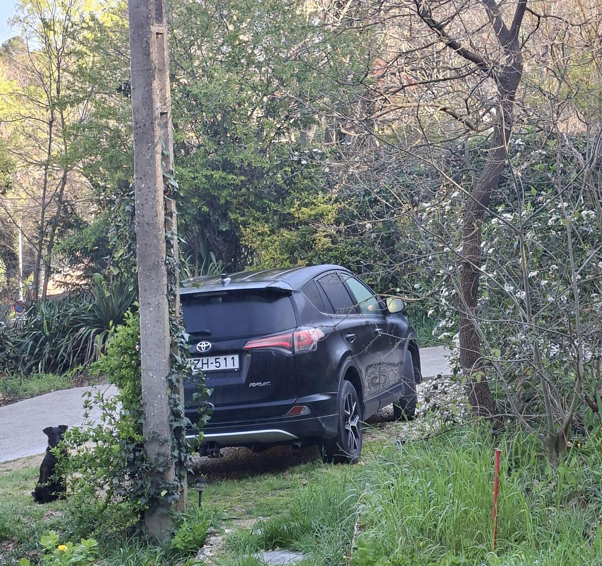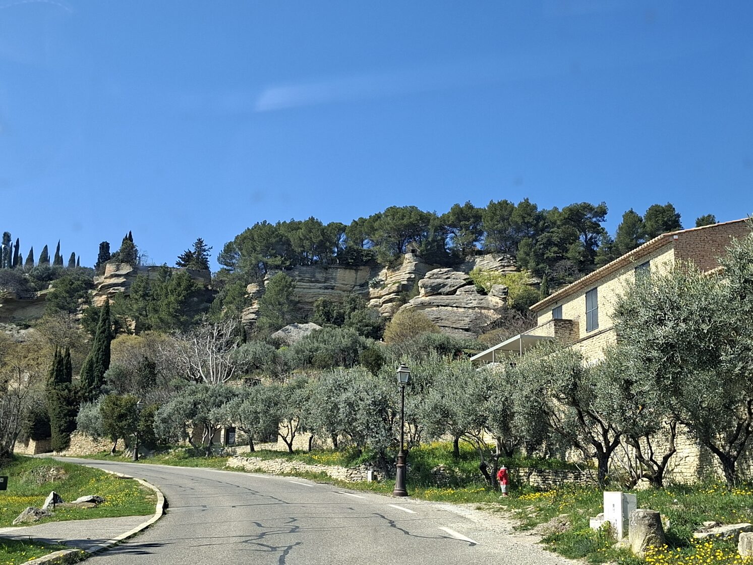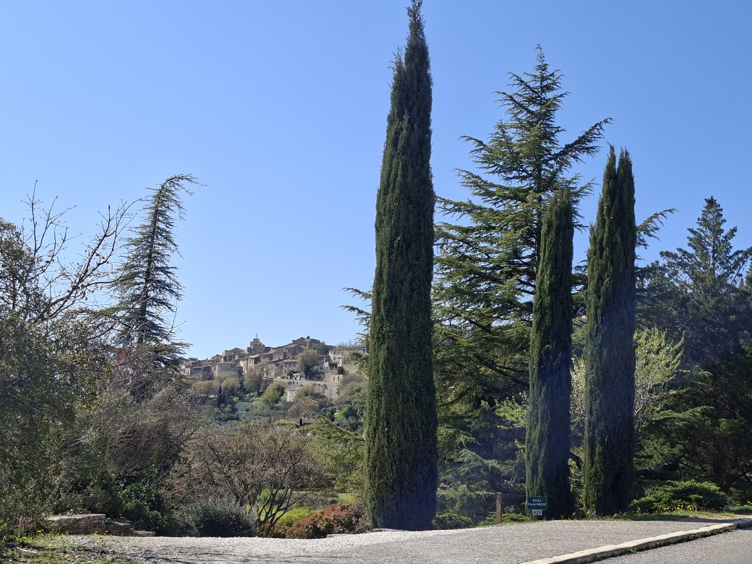 A következő állomásunk a csodálatos fekvésű Gordes volt, 1.600 fő körüli lakosságszámmal. Szerettem volna itt is kiszállni és egy kicsit körbesétálni, de őszintén szólva két kutyával valahogy nem volt kedvem, meg éppen ebédidő volt, sokan voltak mindenhol, parkolóhelyet nem találtam a közelben. Úgyhogy fájó szívvel, de Gordes-nak egy rövid autós körbetekintés után búcsút intettünk és visszamentünk Roussillon-ba ebédelni. Szerencsére közel van egymáshoz a két falu, 10 km a távolság. Pikkpakk találtam parkolóhelyet és elsétáltunk abba az étterembe, amit korábban megjegyeztem magamnak. Megkérdeztem a felszolgálót, hogy két kutyával is szívesen látnak-e. Az iciri-piciri teraszra vezetett és megkérdezte az ott ülő vendégeket, hogy zavarná-e őket két kutya. Mindenki nemleges választ adott, így hát el is helyezkedtünk egy fiatal pár mellett. Sébastien (mint később kiderült, így hívják az asztalszomszédomat) különben is nagyon szereti a kutyákat, egyből elkezdte simogatni őket. Főleg Pankát. Beszédbe elegyedtünk, kiderült, hogy katona. Ötévente új állomáshelyre küldik, most ide küldték Roussillon-ba. Hát nem sajnáltam emiatt, elragadó kis település. Előtte Bretagne-ban voltak (imádták), azelőtt pedig Dijon-ban. Nem rossz. Nagyon fiatalnak tűntek, 35-40-re tippeltem maximum. Az is kiderült, hogy van három gyerekük. A fiuk 17 éves, a két lány 14 és 10. Na meg persze van egy kutyájuk is. „És hogy bírják a gyerekek a rendszeres költözködést?” „Szerencsére nagyon szeretik, és ez rendkívül fontos számunkra.” - ezt a feleség mondta. Hát nem semmi. Sébastien beszélt kicsit angolul, még a menüt is lefordította nekem, amiért nagyon hálás voltam. Kérdeztek felőlem is, elmondtam, hogy mit csinálunk mi így hármasban. Fantasztikus ötletnek találták, engem pedig nagyon bátornak, hogy így egyedül, két kutyával belevágtam ebbe a nagy kalandba. Később, amikor már mindannyian végeztünk az ebéddel és elbúcsúztunk egymástól, éppen a kutyákat csatoltam be a kocsiban a biztonsági hámjukba, amikor Sébastienék elmentek mellettem autóval. Megálltak és még egyszer jó utat és szép élményeket kívántak.