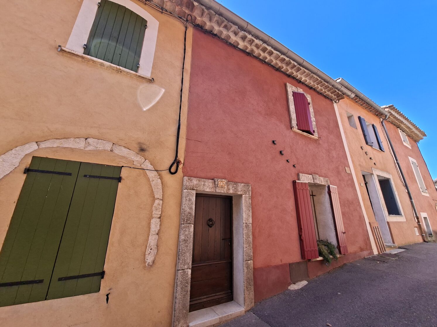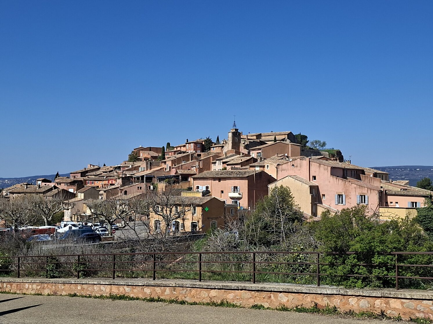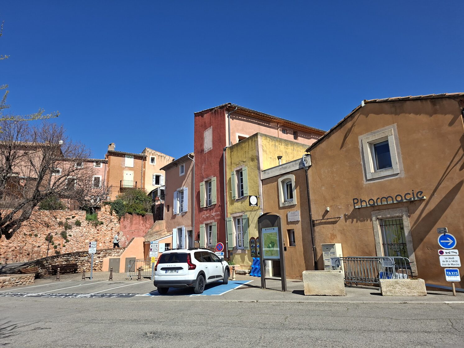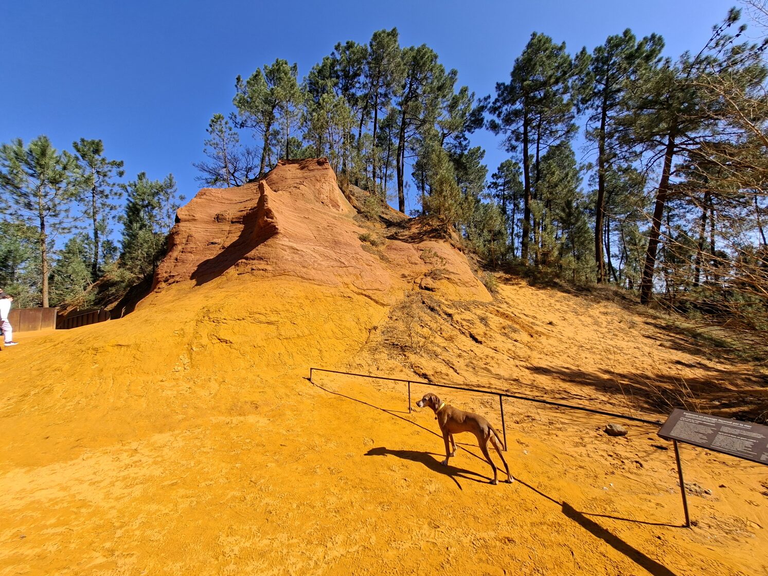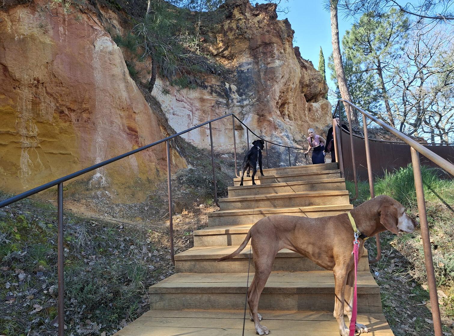 Ma búcsút vettünk a kedves Provence-tól, mégpedig úgy, hogy úton a következő szállásunk felé megálltunk két jellegzetes provence-i faluban és közelebbről is szemügyre vettük őket. Az első falu Roussillon volt, ahol még egy különlegesség is várt minket: az „Okker-tanösvény”. Mivel reggel nem sétáltunk, arra gondoltam, hogy először meglátogatjuk ezt a geológiai érdekességet és utána megyünk be a faluba - egy kis mozgás lenyugtatja majd a kutyákat.