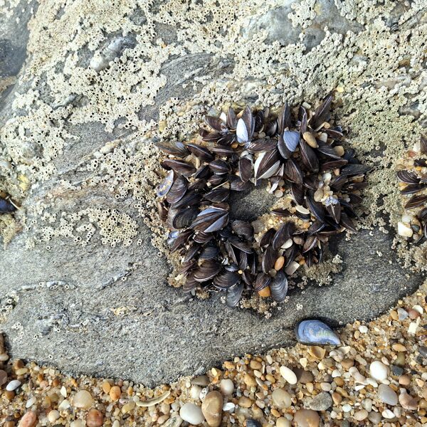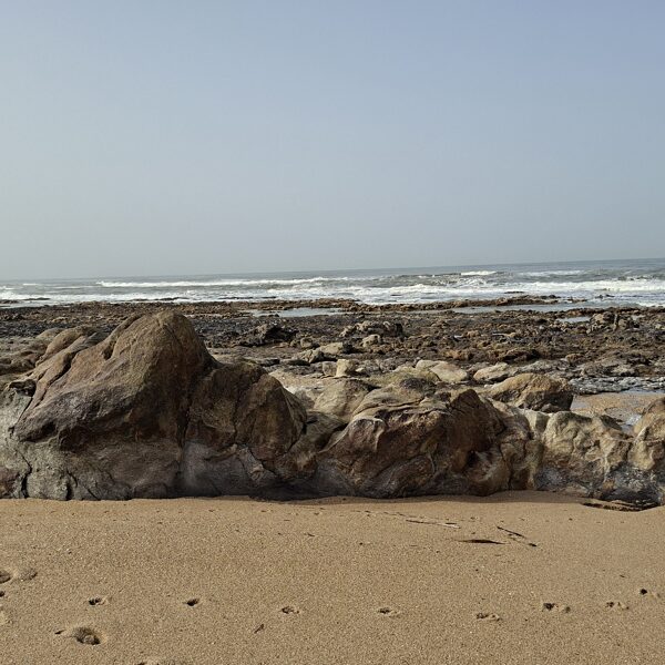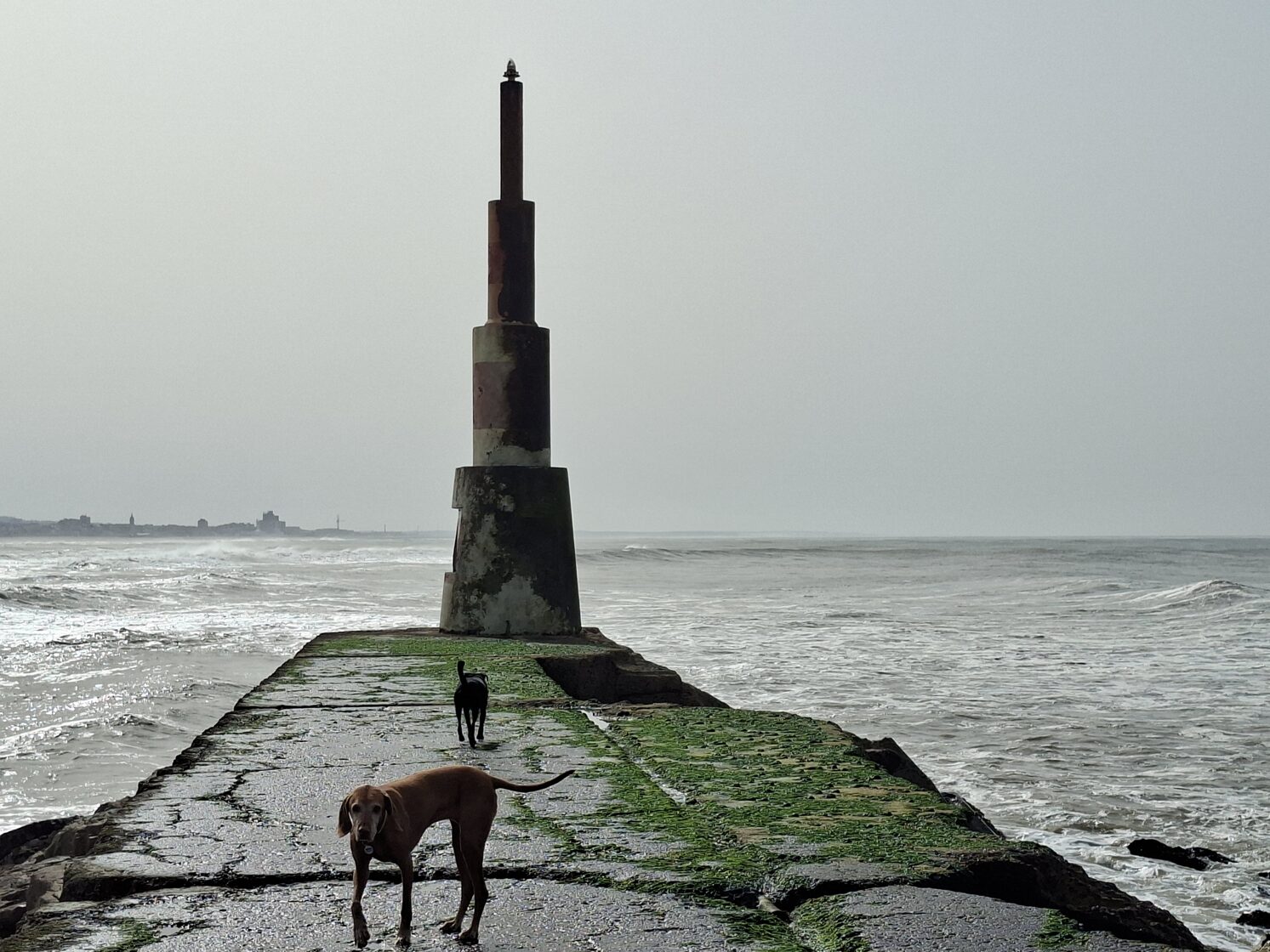 At 9:30 I packed the necessary things into a backpack, we went down to the car and, following the GPS instructions, set off. Down at the oceanfront I then let both dogs off the leash. ChatGPT was right: Panka immediately headed for the sandy shoreline, and Gerbeaud set off toward the dunes. We walked all the way to the small lighthouse at the end of the stone pier, which is very slippery from the green algae. Panka stayed with me the whole way; Gerbeaud, of course, had other ideas. On one side of the pier the ocean laps against it, and on the other side there’s a tiny little cove; between the water-sand and the pier they placed big rocks all the way to the end. Gerbeaud was busy with something else and didn’t notice that we were already halfway along the pier, and he tried to jump up to us by climbing on the big rocks, but vertically there was a vertical wall of about eighty centimeters between the rocks and the top of the pier. I didn’t want to go back, because it was hard enough to get this far, so I told Gerbeaud to wait for us and Panka and I went on toward the lighthouse. But this little guy isn’t one to give up. Not even ten seconds passed and he was standing next to me. In that time he couldn’t have climbed all the way back over the rocks and then, with a sharp turn, caught up with us on this slippery thing. He can always surprise me: steadfast, persistent, he never gives up. How he climbed up the wall is a mystery to me. I’ve seen him climb a one-and-a-half-meter chicken wire fence as if it were a ladder, but this?! It seemed impossible, yet there he was, right beside me.