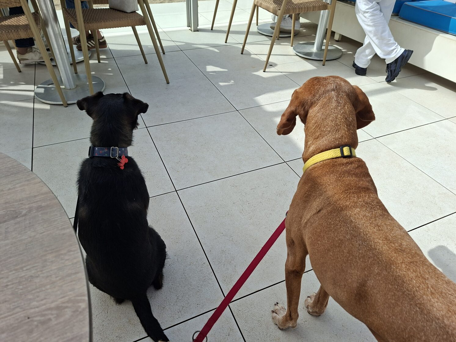 Jump into the car, off to the “Zizi” restaurant. I found it down on the shore by the little cove, away from cars. The little escape artist was sitting on the terrace in complete calm, tied in the shade with a boat rope. I ask the waiter — did he find him? No, his colleague inside did. On the way in I quickly photographed the restaurant’s name. I found the kind colleague, who told me this little dog came up to them; they waited, watching to see if the owner would come with him. No one came. They saw he had a tag and called right away. There are at least five, if not more, restaurants right there next to each other. Why did he walk into “Zizi” specifically? This dog keeps surprising me with more and more unbelievable stories. If someone else told me today’s one, I wouldn’t believe it — it’s that absurd.