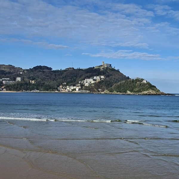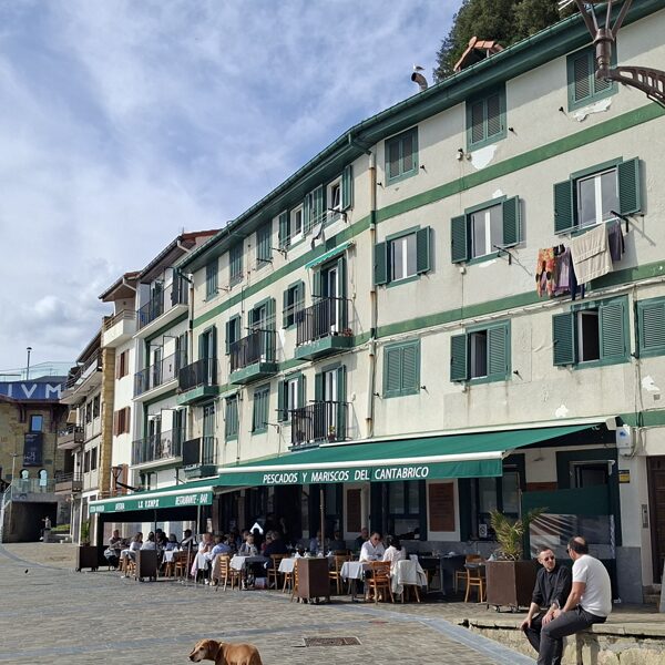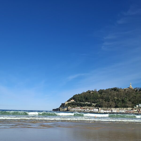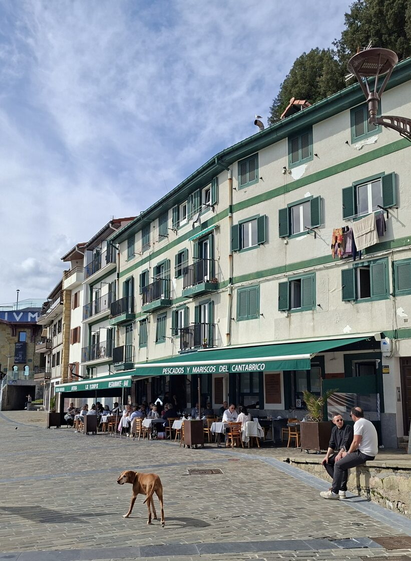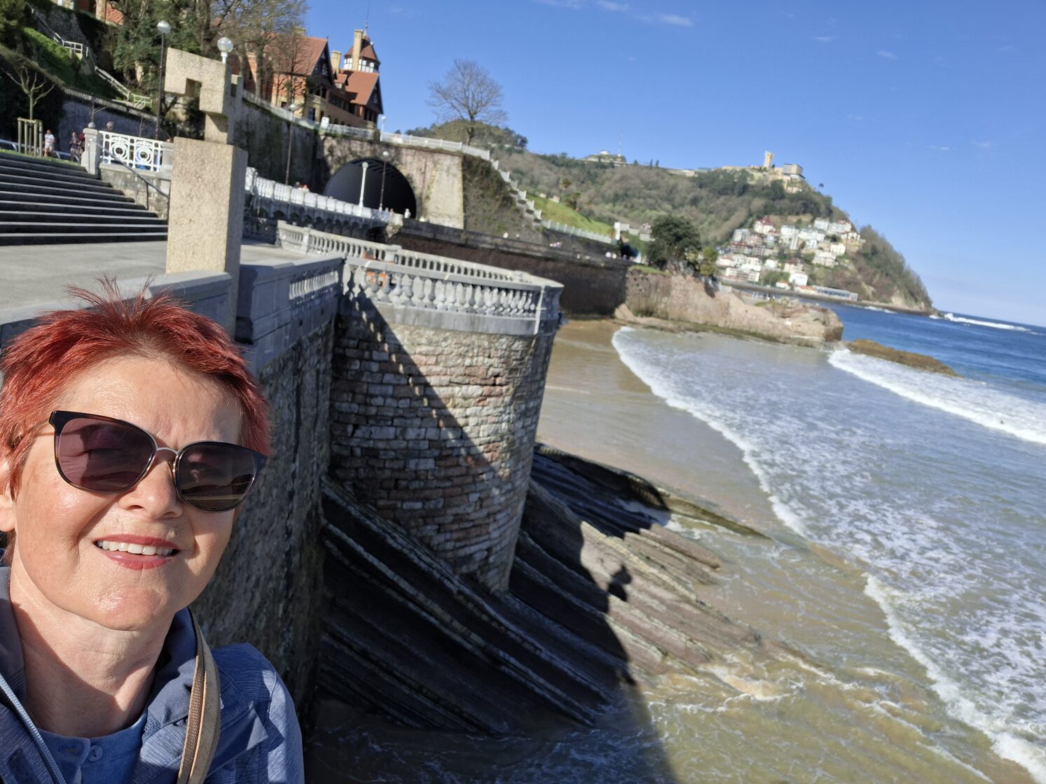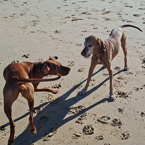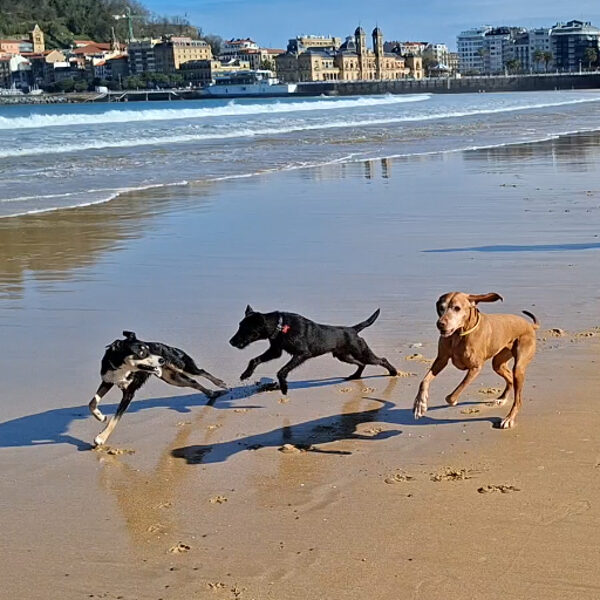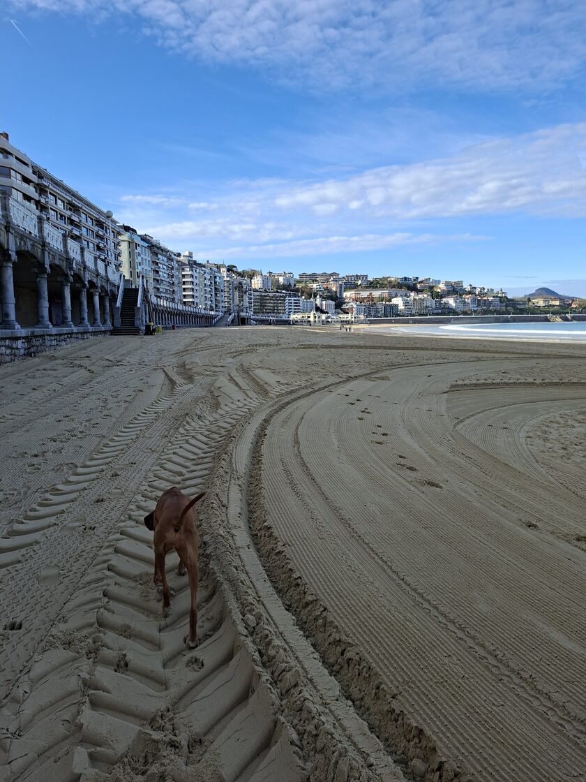 Down on the sandy beach I let Gerbeaud off the leash too; Panka was without a leash anyway — I love that she has become such an independent “young lady,” but of course in her great independence she always keeps an eye on where we’re going. If I call her, she reacts immediately. Bless her heart! Gerbeaud immediately looked around to see who was on the beach, whether there was someone with a ball. Whether there were nice dogs he could have a big run-around with. I made a lot of videos of him because he’s so cool. He loves the ball and can run insanely fast. Often an owner throws a ball for their dog and Gerbeaud catches it. In the past he would run off with it and “laugh” when I tried to ask/take it from him. Now I can stop him nicely; he lies on his back in the sand and I simply take it out of his mouth. He ran a ton, made friends, played ball — he really enjoyed all of it. Panka was more around me, but sometimes she also joined in a bit of chasing. We met a young female Vizsla named Sarah. Her owner was a young Polish woman who works in Barcelona, and she spent four days in San Sebastián with her partner. We had a nice chat. Her dog is from a breeder in Poland; Vizslas are very popular there. In Spain, however, they’re considered a rarity and people always stop her to say what a beautiful dog she has. And then when they pet her (the dog, of course), they swoon over how silky her coat is. Well yes — the Vizsla is a fragrant silky wonderdog.