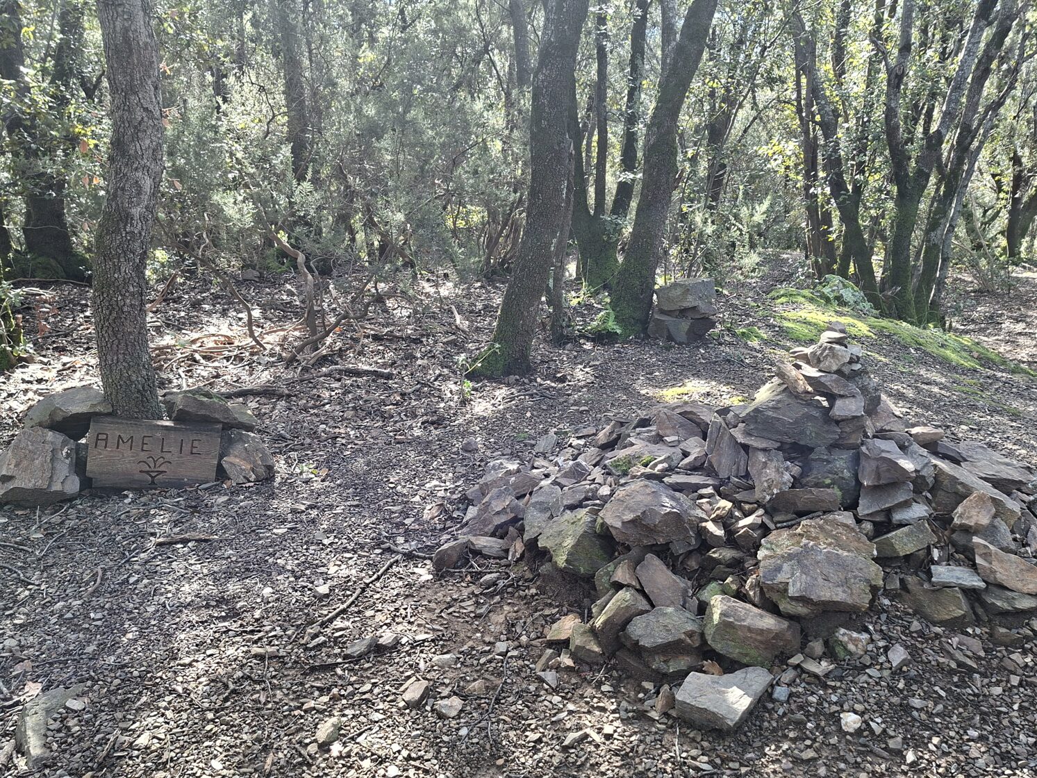 About an hour later, we came to a sign and a cairn. The sign read: AMELIE, and a spring symbol was carved into it. The town where we are is named after this spring: Amélie-des-Bains. From here, we had two choices: continue on toward Montbolo or head down to Amélie-des-Bains on a different path. I chose the latter. The forest is really cool; I even found some cork trees. I like these trees so much. It’s so interesting: they peel off the bark to make cork stoppers and all sorts of other objects, and the tree doesn’t die — it lives on and regrows its bark. Wonderful Nature. They tried planting these trees in the United States and China, but they didn’t take root. Their true home is Portugal. However, it seems that some have migrated to Spain and France.