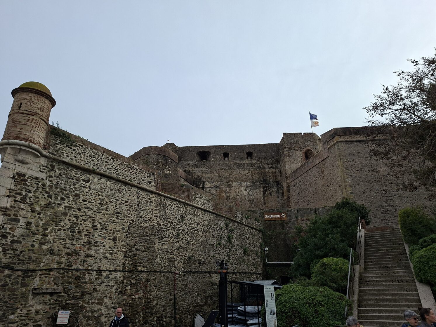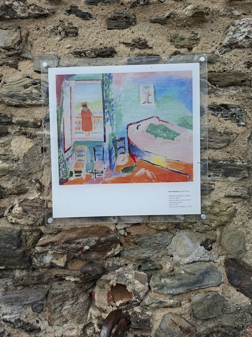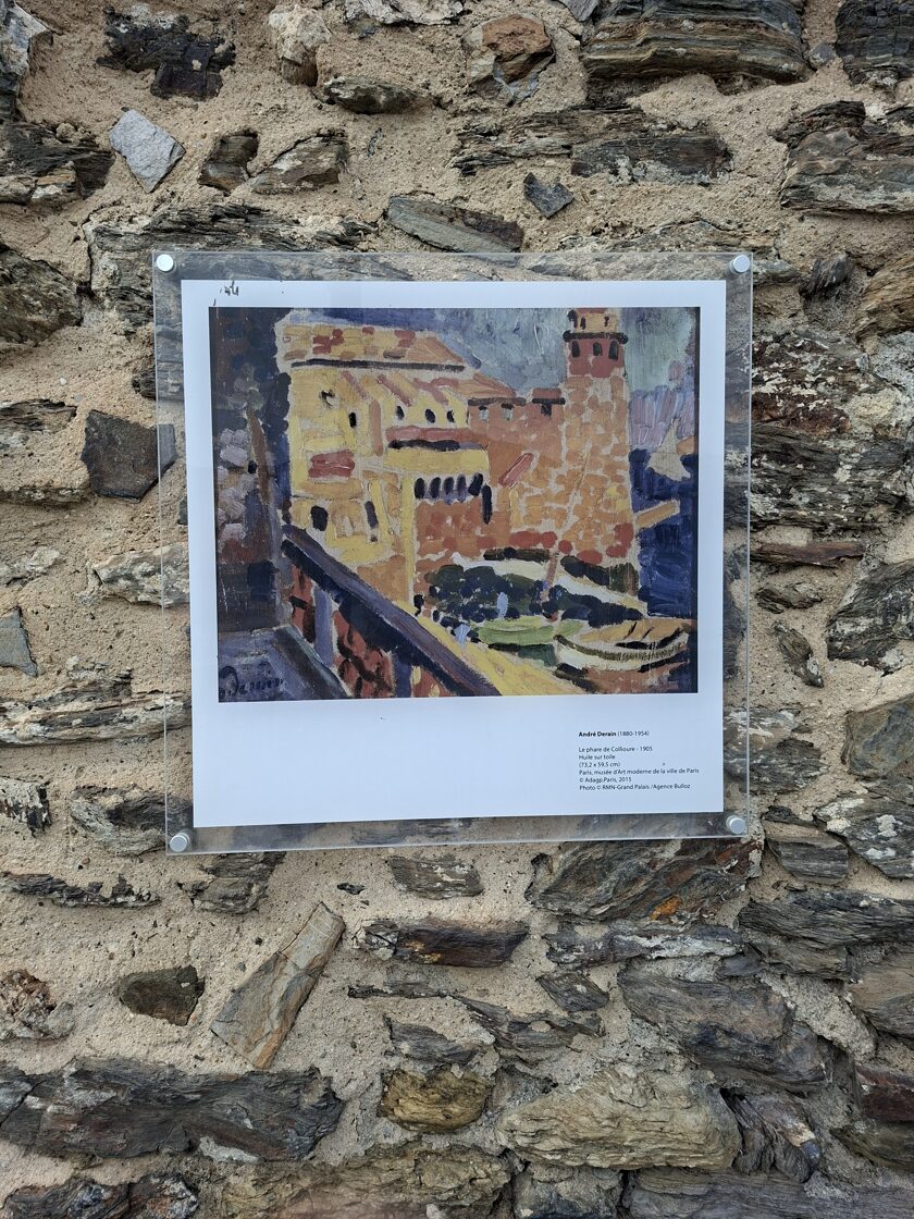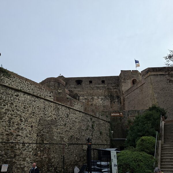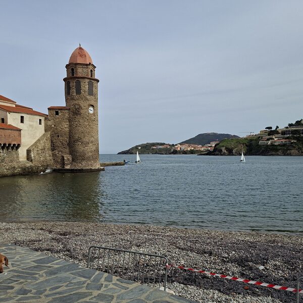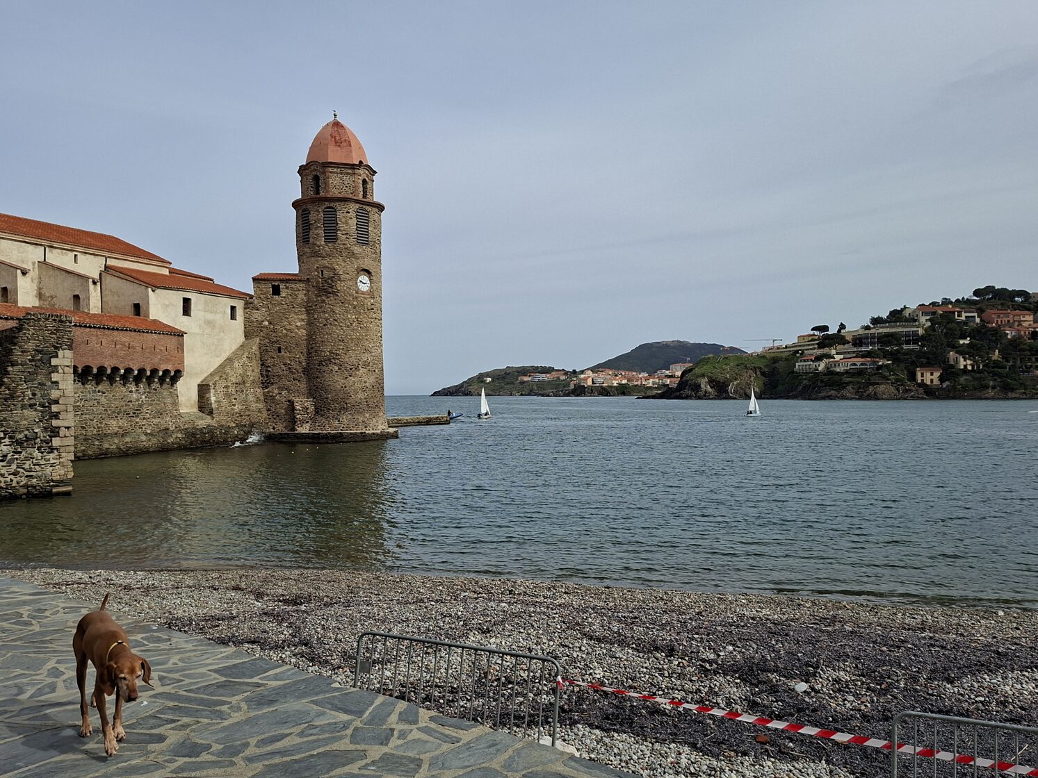 After breakfast, I ran into Vincent, the receptionist who “doesn’t speak a word of English,” and he recommended the path behind the hotel for a walk, saying how nice it was because there were no cars there. Well, we already walked that yesterday, thank you very much! It really is very nice. He was impressed. Then we ended up heading in that direction anyway, because I figured I’d walk the dogs for twenty minutes, then we’d get in the car and go to Collioure. Then, as we were walking along, Panka ran up a driveway on the right. I turned to see what she was up to, and I saw a few steps and a sign leading to a hiking trail. Well, let’s go this way! It was a great decision. It really gave our legs, hearts, and lungs a good workout. We walked through the forest the whole way. Birds were singing overhead. All the dogs were really enjoying the freedom. Gerbeaud would either run ahead or fall behind, but eventually he always showed up. I stopped once to take a picture of the trail, then had a thought and turned around to take a picture of where we’d come from. And then I caught sight of that magnificent, snow-capped mountain peak in the distance. What a majestic sight! I’m so glad I stopped right then and there, and even turned around! At times like this, I always feel like David’s hand is in it too. It’s such a good feeling.
