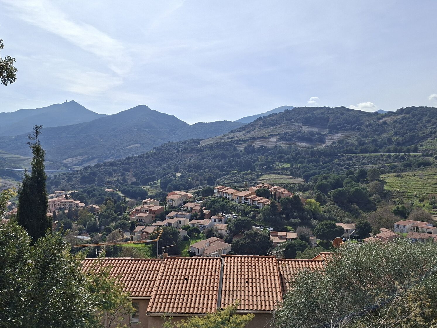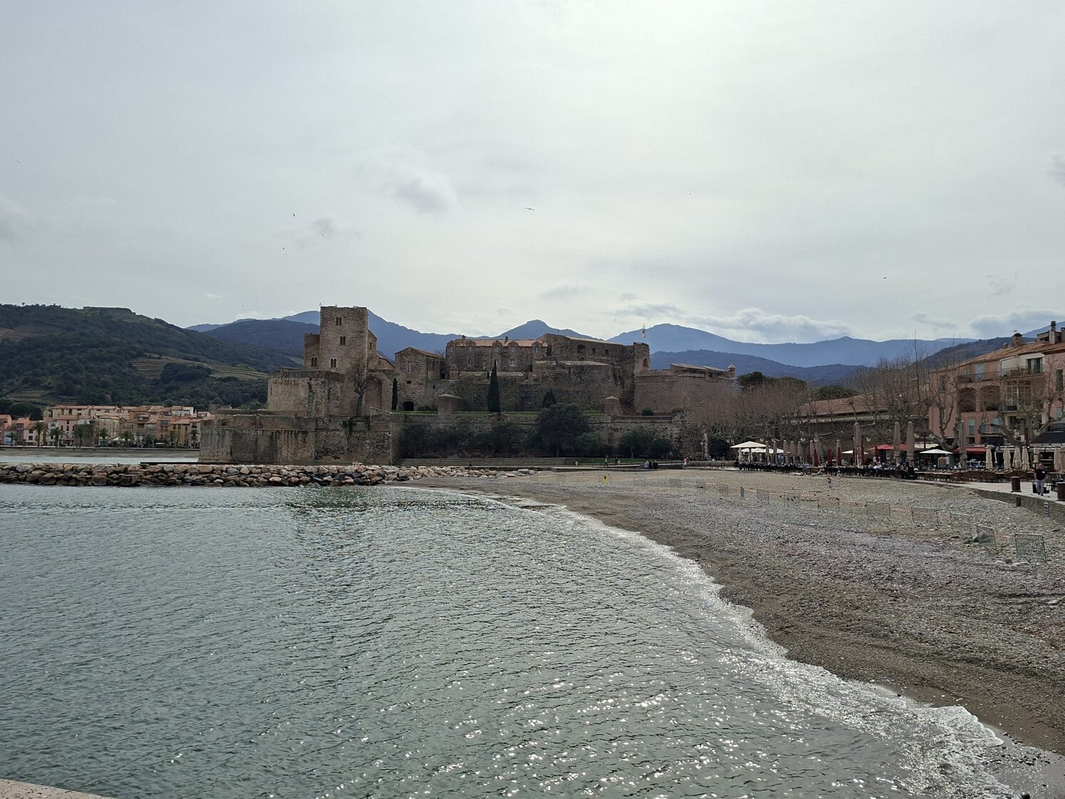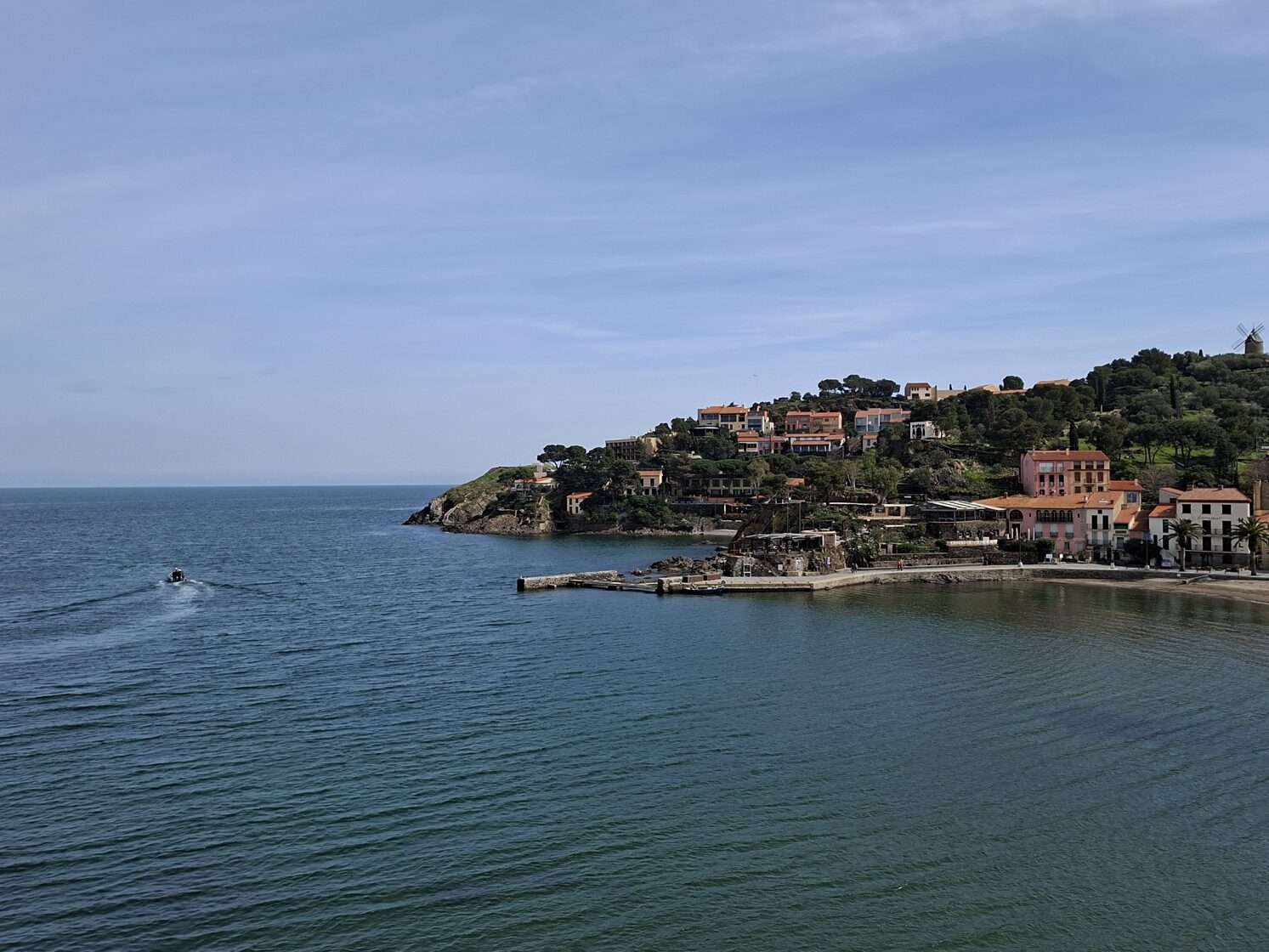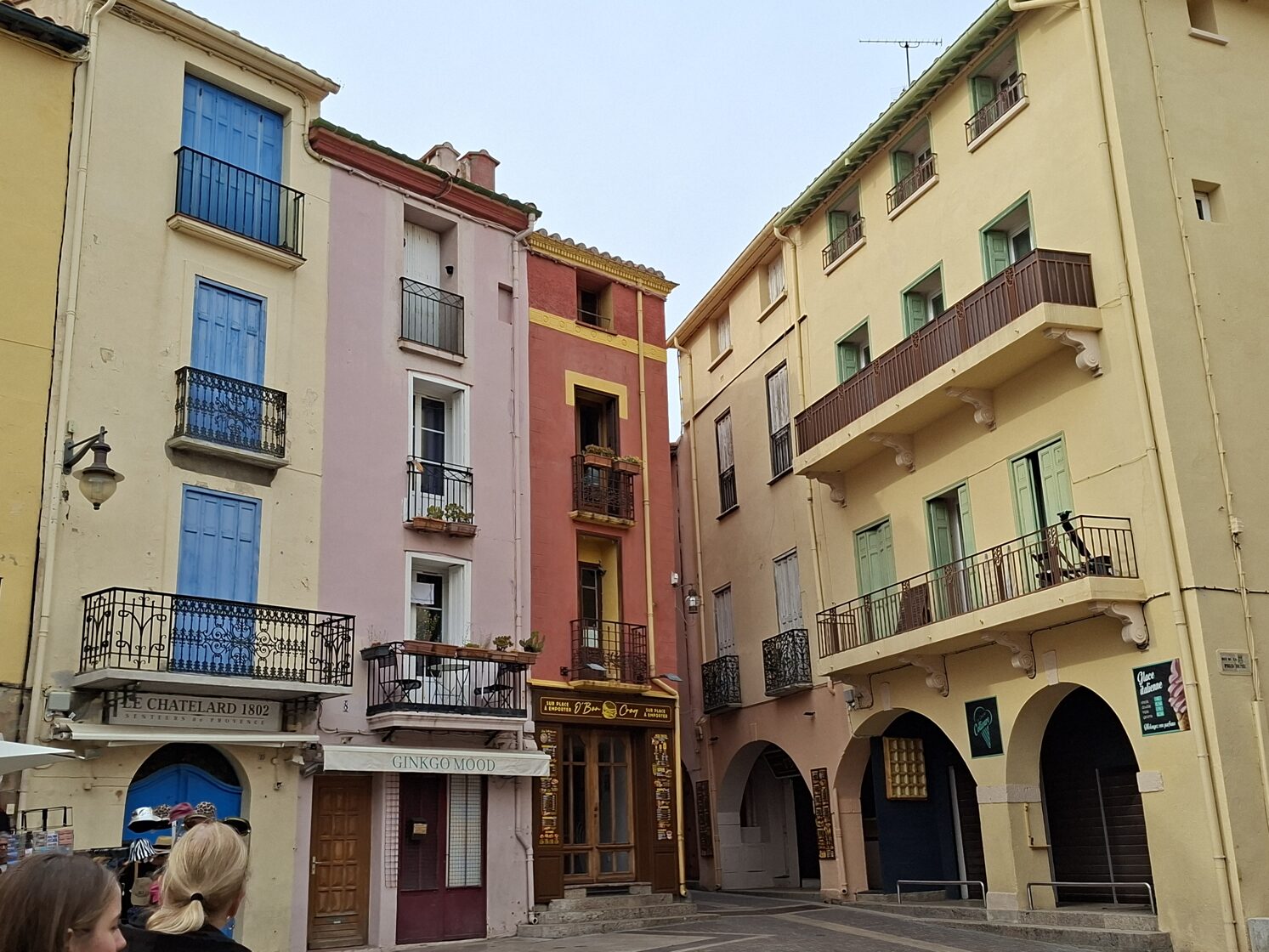 After breakfast, I ran into Vincent, the receptionist who “doesn’t speak a word of English,” and he recommended the path behind the hotel for a walk, saying how nice it was because there were no cars there. Well, we already walked that yesterday, thank you very much! It really is very nice. He was impressed. Then we ended up heading in that direction anyway, because I figured I’d walk the dogs for twenty minutes, then we’d get in the car and go to Collioure. Then, as we were walking along, Panka ran up a driveway on the right. I turned to see what she was up to, and I saw a few steps and a sign leading to a hiking trail. Well, let’s go this way! It was a great decision. It really gave our legs, hearts, and lungs a good workout. We walked through the forest the whole way. Birds were singing overhead. All the dogs were really enjoying the freedom. Gerbeaud would either run ahead or fall behind, but eventually he always showed up. I stopped once to take a picture of the trail, then had a thought and turned around to take a picture of where we’d come from. And then I caught sight of that magnificent, snow-capped mountain peak in the distance. What a majestic sight! I’m so glad I stopped right then and there, and even turned around! At times like this, I always feel like David’s hand is in it too. It’s such a good feeling.