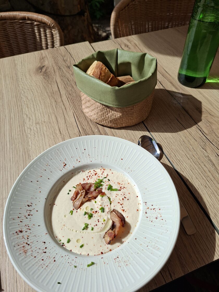 At 7 a.m., I rushed out with the dogs for a walk. The hallway is so long that I didn’t want to risk them peeing on the carpeted floor in because they couldn’t hold it any longer. It worked. Then I went back to bed for another hour or so. Breakfast wasn’t bad, but it’s so strange to me that the French and Spanish don’t eat vegetables. Daviddel and I always ate tons of vegetables for breakfast. Here, it’s mostly croissants with jams, muesli, and (because of the German tourists) cold cuts and cheese. However — much to my delight — I was able to make myself a soft-boiled egg using a wonderful contraption. Vincent’s dog, Obelix (a black-and-gold King Charles Cavalier Spaniel), lay down next to me. The poor thing doesn’t know how cold-hearted I am with dogs at the dining table. But I petted him, which he really enjoyed, and he stretched out next to my chair like a frog.