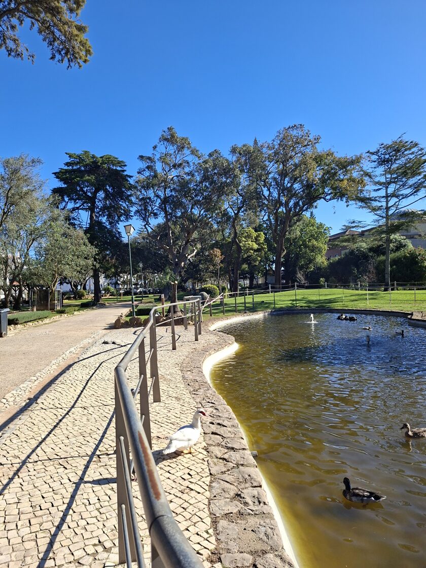We agreed to meet at 10 a.m. in the parking lot behind the Cascais market. I arrived half an hour early on purpose to let the dogs stretch their legs a bit. I parked in a great spot, because two minutes away from the parking lot, there was a lovely little green oasis with a babbling brook and a path along the shore. I let Panka off the leash, kept Gerbeaud close to me, and we had a nice walk before the meeting.