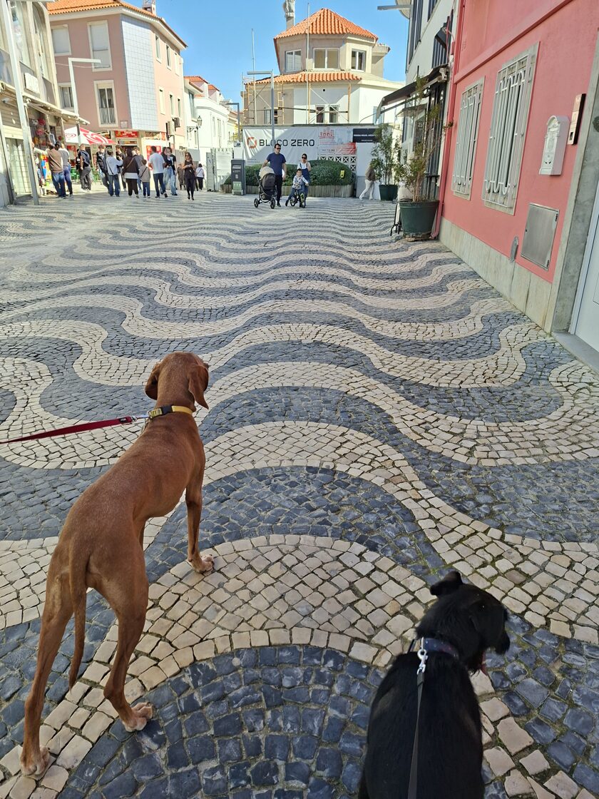 Nóri is a very kind, smiling young woman and mother; I immediately sensed that we were going to have a good day. First, we walked around the center of Cascais a bit, looked at a lighthouse from the outside, and went down to the sandy beach on the oceanfront, where I let the dogs off the leash. Gerbeaud immediately ran to the other dogs to "hang out," while Panka circled around us, not straying far. Then, when Gerbeaud picked up a ball belonging to a mother and daughter playing ball and proudly carried it around the beach — seeing the mother's disapproving glances — I thought it best to take it from him, put him on a leash, and move on. So far, this has been my only negative "experience"; everyone loves my dogs, really. People here are very dog-friendly.