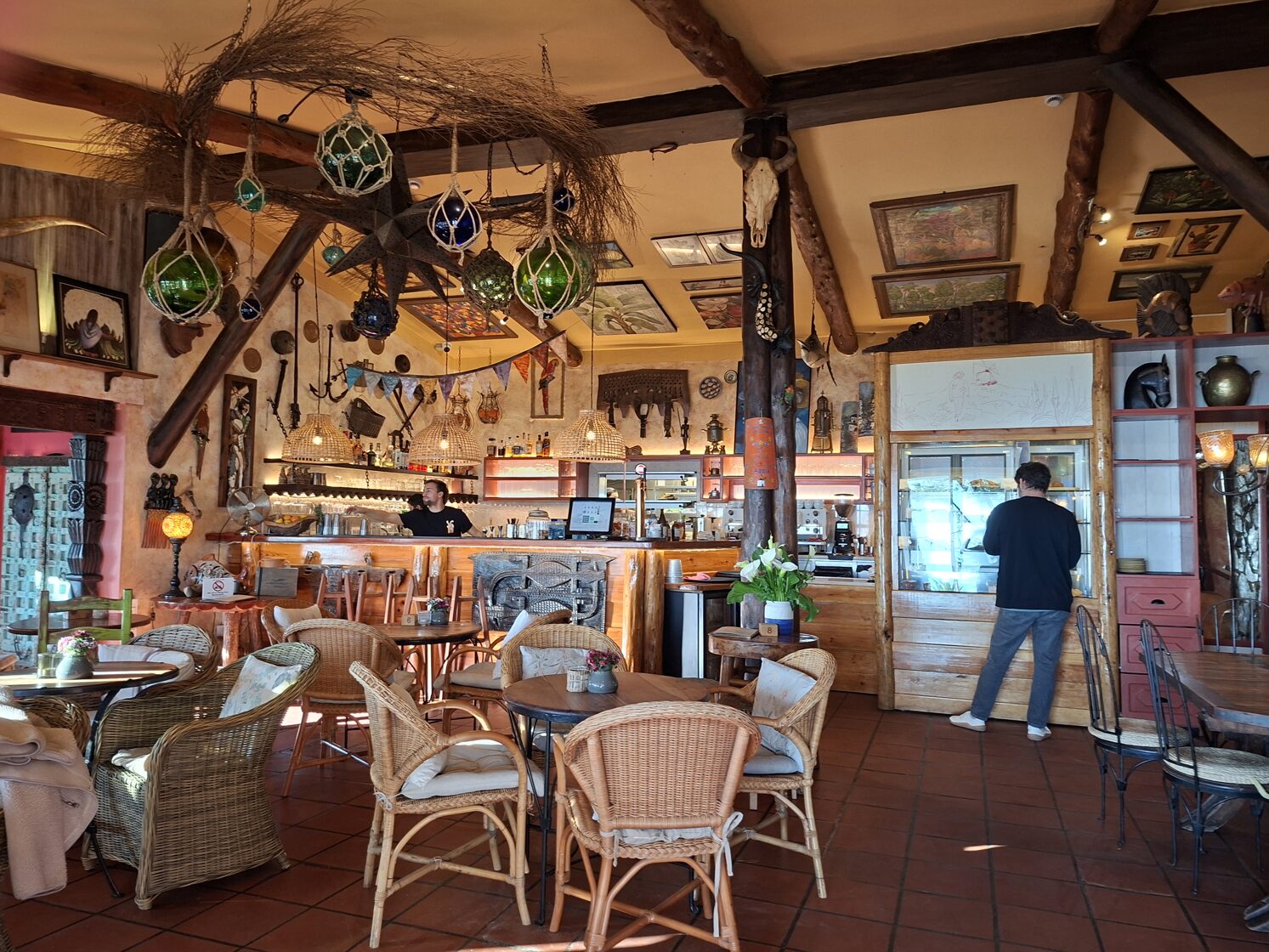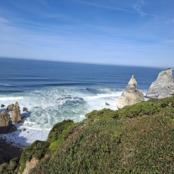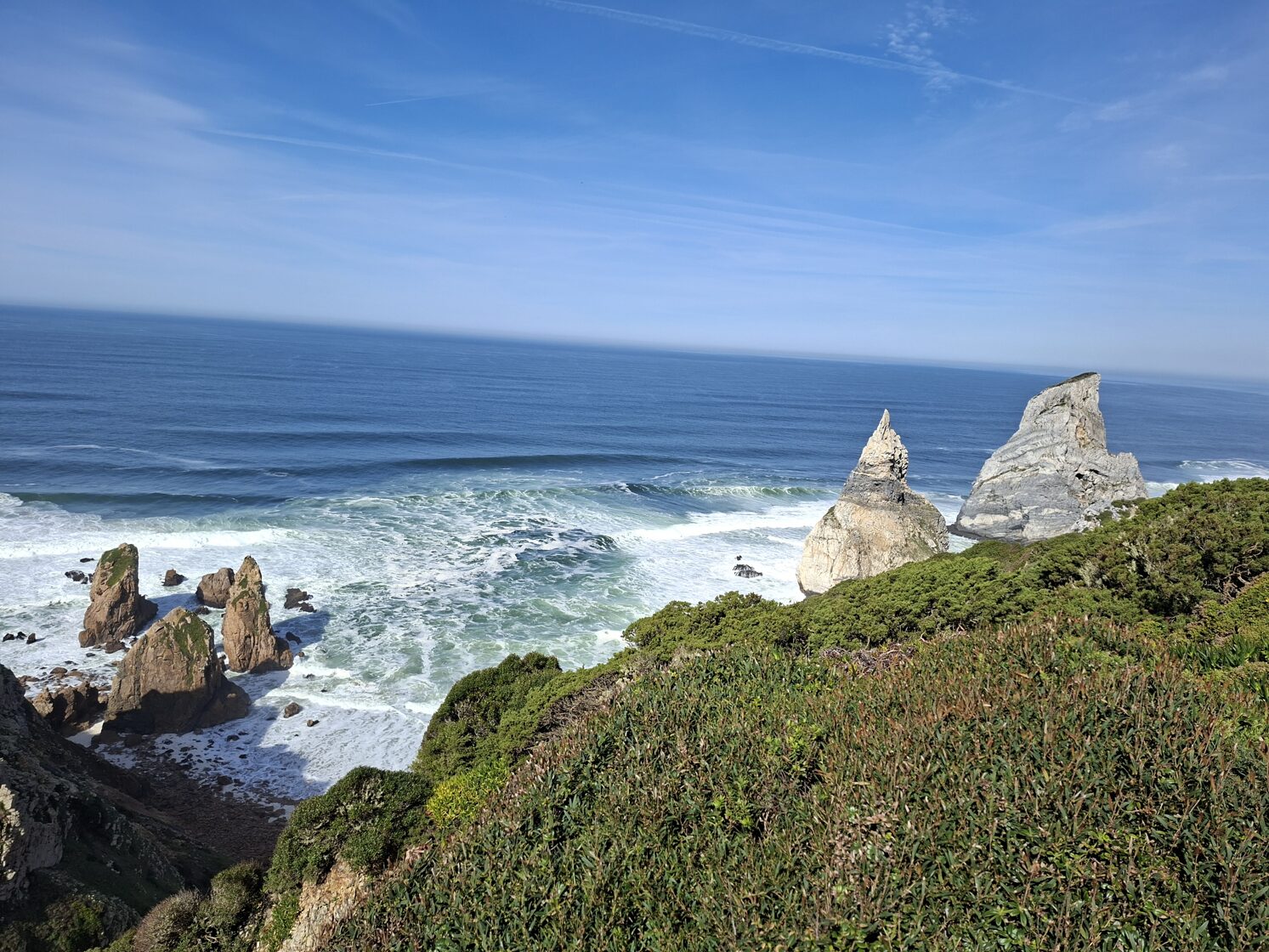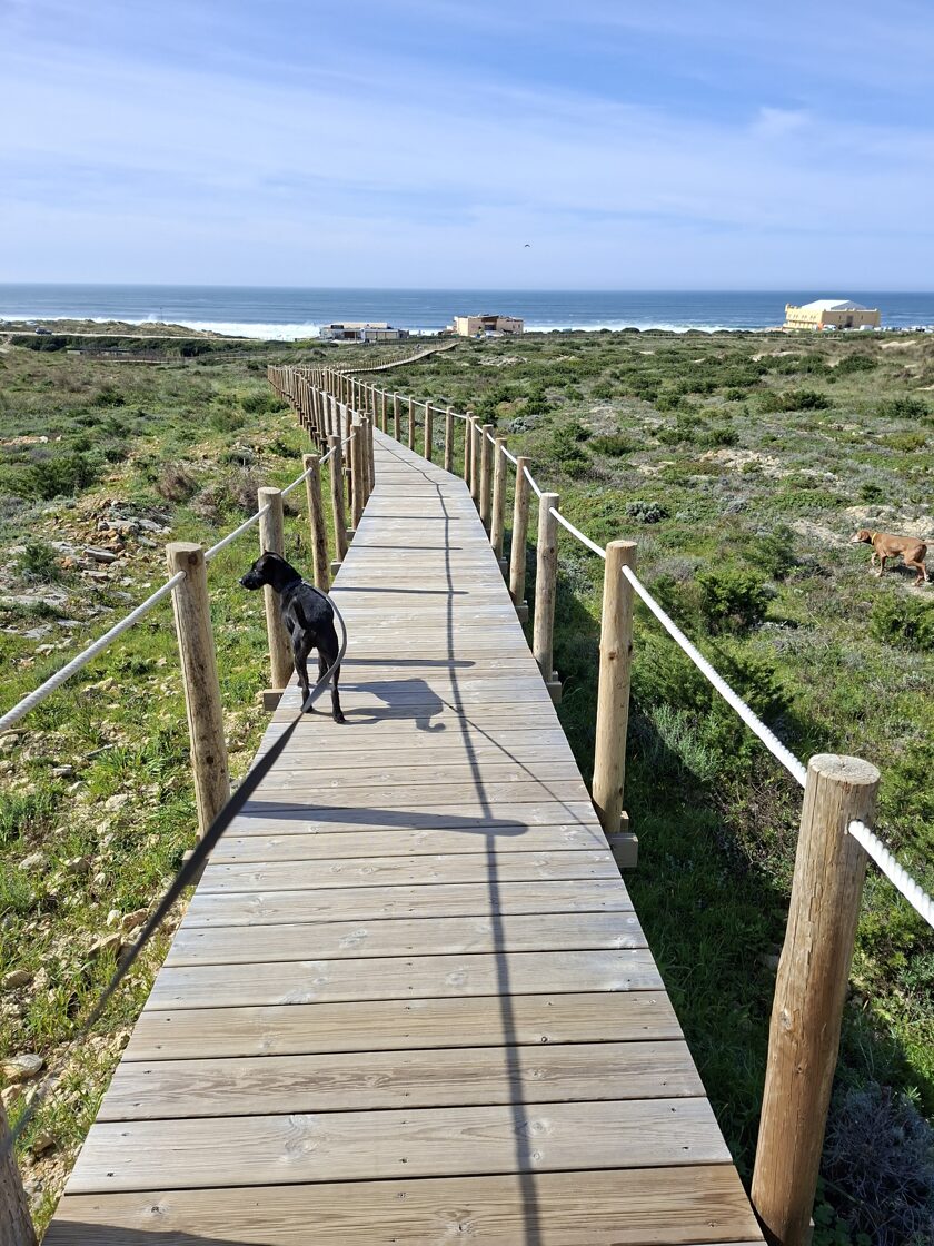 We stopped several times at the oceanfront to admire the vast expanse of water, stretch our legs, and let the dogs run. Praia da Cresmina and Guincho; Núcleo de Interpretacao da Duna da Cresmina (This is a cool little dog-friendly café on top of the sand dunes. Why does it have such a long name? Almost everything here has a long name here. No clue about their reasoning.) While we drank delicious iced coffee, the dogs lay down nicely in the "dog café" designated for them.