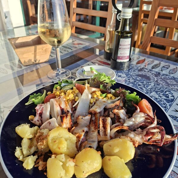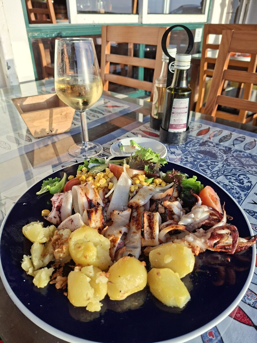 Mein Abendessen war eine köstliche – und riesige – Portion gegrillter Tintenfisch mit Ofenkartoffeln, Salat und einem Glas Weißwein. Die Tische des Restaurants standen draußen auf dem Bürgersteig, auf einer etwa 20 cm hohen „Plattform” mit Holzboden. Die Hunde benahmen sich sehr gut, und Passanten blieben mehrmals stehen, um zu fragen, ob sie sie streicheln dürften. Natürlich! Als die Sonne langsam unterging, hatte ich mein Abendessen beendet. Wir saßen noch ein paar Minuten da, dann bezahlte ich und wir gingen zum Auto. Ich hatte in einer Straße parallel zur Küste geparkt, eine Minute vom Meer entfernt. Ich zahlte 400 Forint für zwei Stunden. Nicht schlecht, oder?