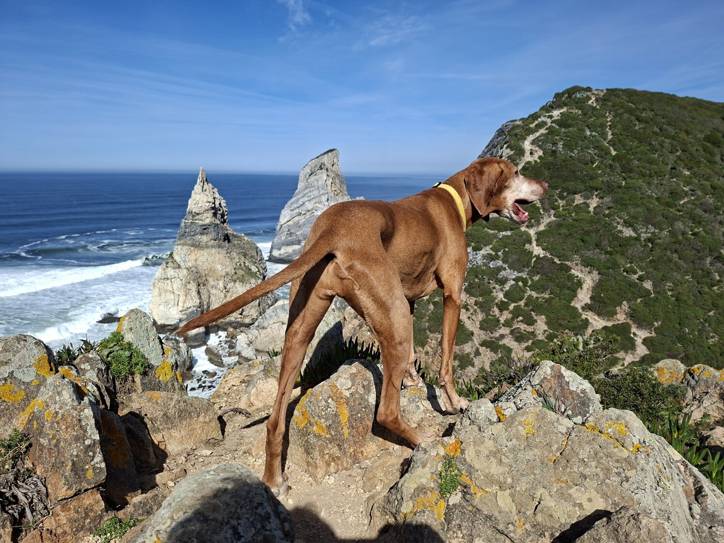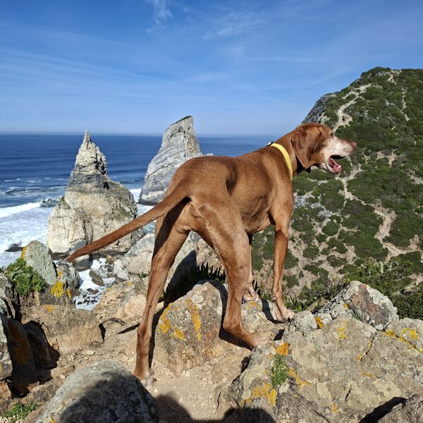 Wir starteten am Parai Ursa (Bärenstrand) und schlängelten uns bei strahlendem Sonnenschein durch die Kurven, entlang des steilen, schmalen Pfades. Ich ließ Gerbeaud von der Leine, damit er mich nicht versehentlich vom Weg abbringen würde, der voller rollender Steine war. Es war ein wunderbares Abenteuer, wir haben es wirklich genossen. Panka war in ihrem Element, rannte wie eine kleine Bergziege herum und schien überhaupt keine Höhenangst zu haben. Sie stand so mutig am Rand der Felsen, dass ich erstaunt war.