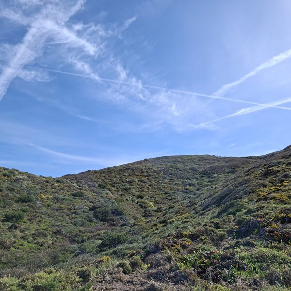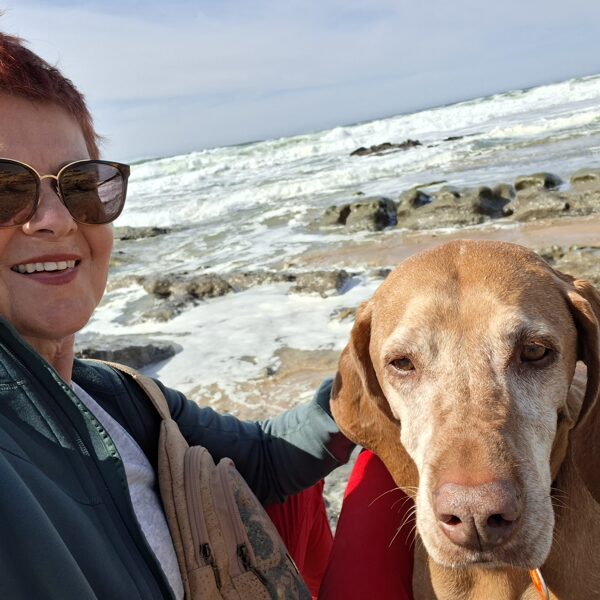 Ich machte einige sehr schöne Fotos von den Hunden und der Landschaft. Von dort aus gingen wir zu einem Café auf der Spitze der Dünen, wo wir nach einigen köstlichen Backwaren und einem Koffeinschub über den Holzsteg durch die Dünen zum Meeresufer spazierten, wo ich gestern die Rosen ins Wasser geworfen hatte. Wir kletterten zum Wasser hinunter, und Gerbeaud fand sofort einige Hunde, die er beschnüffelte, und verschwand, um sie zwischen den Felsen und Steinen zu jagen. Panka folgte mir überallhin, und ich konnte sogar einige Fotos von ihr machen, was eine ziemliche Leistung ist!