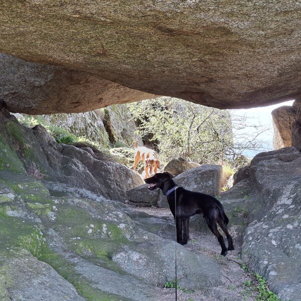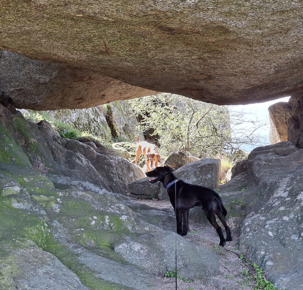 Panka war die ganze Zeit ohne Leine unterwegs; sie war sehr brav. Gerbeaud war an der Leine, bis ich ihn auf dem Weg die sehr steilen Treppen und Felsen hinunter losließ, damit wir uns gegenseitig nicht in unserer Bewegung einschränkten und nicht stürzen konnten. Dann, während ich die Schweineställe fotografierte, machte sich der kleine Abenteurer aus dem Staub. Warum auch nicht, oder?! Ich rief und rief – er kam nicht. Nach dem fünften Ruf machten Panka und ich uns auf den Weg durch die Straßen des Dorfes. Ich war mir sicher, dass er früher oder später auftauchen würde. In der Zwischenzeit hielt mich ein spanisches Paar an und fragte mich, ob ich ein Foto von ihnen machen könnte. Natürlich! Panka tummelte sich vor ihnen herum. „Mit oder ohne Hund?“, fragte ich. „So oder so, sie ist so ein schöner Hund!“ Ich machte ein Foto mit ihr und eines ohne. Übrigens, so sehr Panka es früher hasste, fotografiert zu werden, seit unserer Reise ist sie so entspannt, dass sie einfach lässig in die Fotos aller Leute hineinspaziert. Nun, Gerbeaud tauchte immer noch nicht auf. Ich holte tief Luft, drehte mich um, sagte Panka, wir müssten ihren trotteligen Bruder suchen, und wir kletterten den steilen Hügel hinauf – meine Knie stießen fast an meine Brust – zu den Schweineställen. „Geeeeerbeaud!“ Bei meinem zweiten Ruf tauchte der kleine Entdecker keuchend auf. Ich bin ehrlich: In dem Moment, in dem ich ihn sehe, verfliegen meine Wut und meine Sorge – er ist so ein cooler kleiner Kerl. Und zum Glück gibt es hier keine Autos, keine Motorräder, keine wilden Tiere. Natürlich habe ich ihn sofort wieder an die Leine genommen. In solchen Momenten springt Panka etwa zwei Minuten lang vor Gerbeauds Gesicht herum, als wollte sie sagen: „Wo warst du denn? Hast du Mama nicht rufen hören? Sie war total nervös, weil sie nicht wusste, wo du geblieben bist. Ich muss sagen, ich bin ein bisschen neidisch. Aber ich bin die brave Panka – ich würde mich nie trauen, das zu tun, was du tust. Später werde ich dich gründlich beschnuppern, um herauszufinden, wo du warst und wen du getroffen hast, okay?“