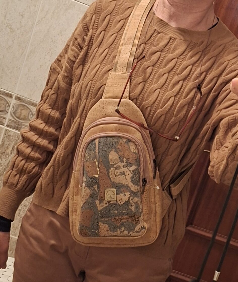 Nach ein bisschen Herumirren und hunderten Kurven und Wendungen kamen wir an unserem Ziel an. Wir verpassten die letzte Führung des Tages, aber sie zeigten uns einen Film darüber, wie sie die Rinde von den Bäumen schälen, wie sie sie glätten, wie sie sie verarbeiten. Unglaublich! Und wie viele Dinge man daraus machen kann! Natürlich konnte ich nicht widerstehen, eine Tasche zu kaufen, die man quer über den Körper trägt, aber vorne trägt, damit ich sie im Auge behalten kann. Sie ist wasserdicht, leicht, hübsch, und ich unterstütze die portugiesische Wirtschaft. Und ich habe auch ein Brillenetui gekauft, weil ich das alte aus Versehen weggeworfen habe, als ich zu Hause beim Packen war.